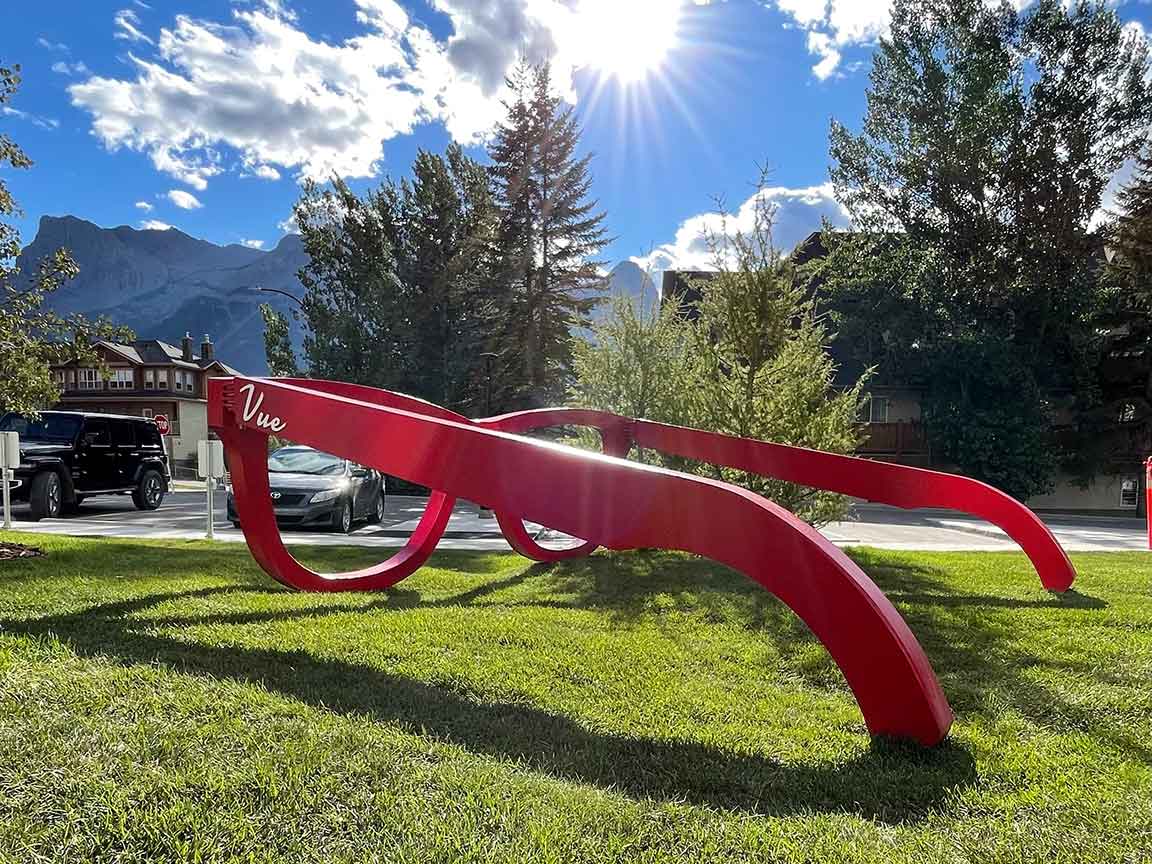A giant set of Raybans gracing the front lawn of the VUE luxury apartments in Canmore.